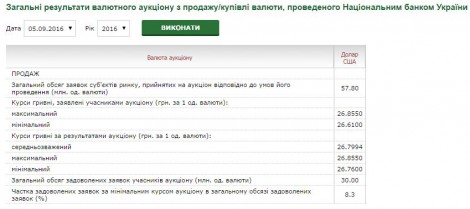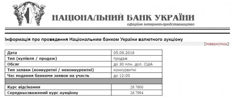 Вот и смотрим. 05.09.2016 НБУ продает до $30 млн. Естественно, покупают участники, т.е. банки. Также здесь мы находим курс отсечения, обратите внимание: 26,7600!