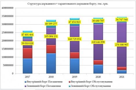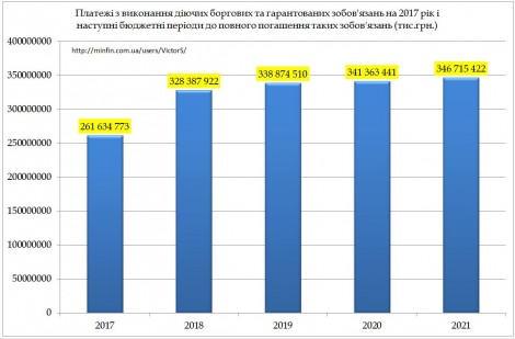 Загалом за 5 наступних років держава повинна з наших кишень виплатити 1,6 трильйона гривень, що більше ВВП-2014 і дещо менше ВВП-2016. На обслуговування буде потрібно 416 млрд. гривень а на виплату тіла 1201 млрд. гривень. Середня тяжкість обслуговування за 5 років складе 34,7%.