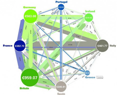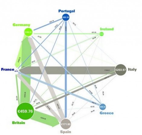 круги с названиями стран – общий объем долга (площадь круга пропорциональна размеру суммарного долга страны). Хорошо видно, до какой степени в долгах Англия, и отчего Италия была вынуждена ввязаться в ливийскую авантюру Саркози (вон какой долг у Италии перед Францией).