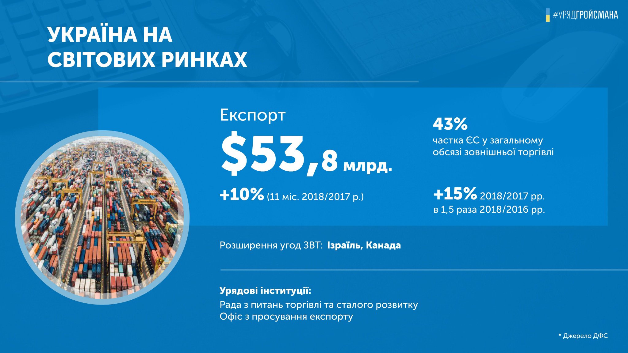 - «Мы за 11 месяцев получили $53,8 млрд экспорта украинских товаров на мировые рынки. Почти 43% — это рынок Европейского Союза », — сказал премьер-министр.
