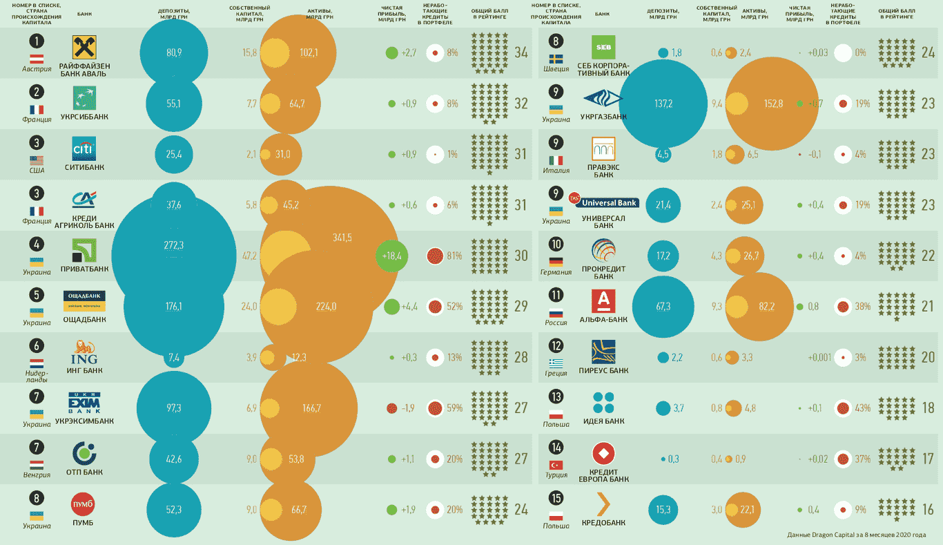 Всего в топ-20 попали 14 банков Украины с иностранными владельцами, 3 государственные банки и 3 украинские коммерческие банки.