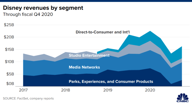 В четвертом квартале 2020 финансового года выручка Disney упала на 23% и составила $14,7 млрд.