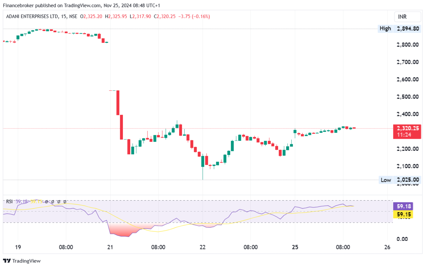 На этом графике изображен 15-минутный график изменения цены Adani Enterprises Ltd. (NSE: ADANIENT). В течение наблюдаемого периода акции демонстрировали значительную волатильность, отражая как резкие падения, так и последующее восстановление.
