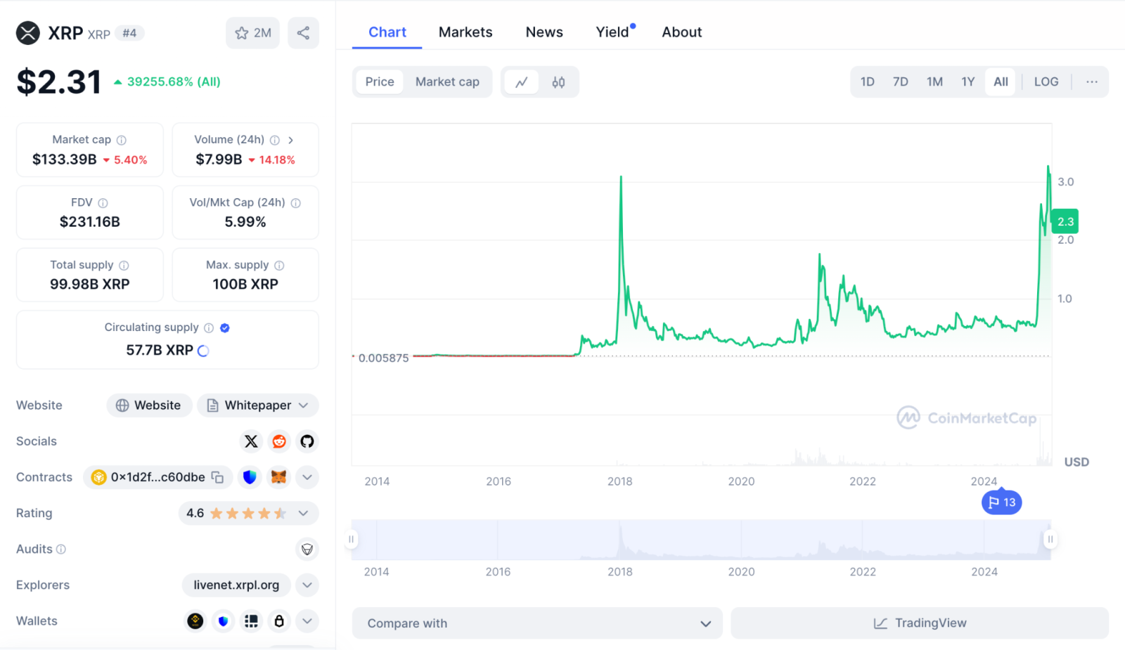 График XRP указывает на бычий тренд, с текущей ценой в $2.31 после сильного прорыва из длительной фазы консолидации. Этот восходящий тренд прорвал ключевые уровни сопротивления, сигнализируя о возобновившемся покупательском давлении и сильном рыночном настрое. Существенный рост цены поддерживается здоровым объемом торгов, что свидетельствует о доверии инвесторов в долгосрочный рост.