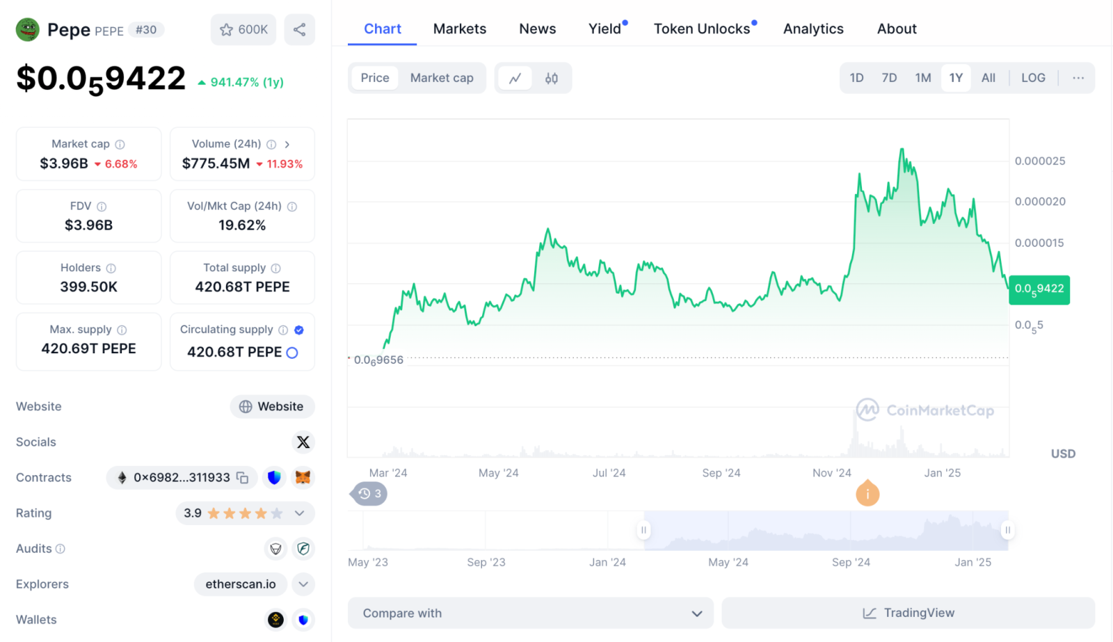 Постоянный объем торгов (на данный момент $775.45M) указывает на устойчивый интерес инвесторов, поддерживая вероятность восстановления. Если цена останется выше ключевых уровней поддержки и преодолеет сопротивление на предыдущих максимумах, PEPE может увидеть возобновленный бычий тренд. С сохранением интереса рынка, актив имеет потенциал для роста в этом году.