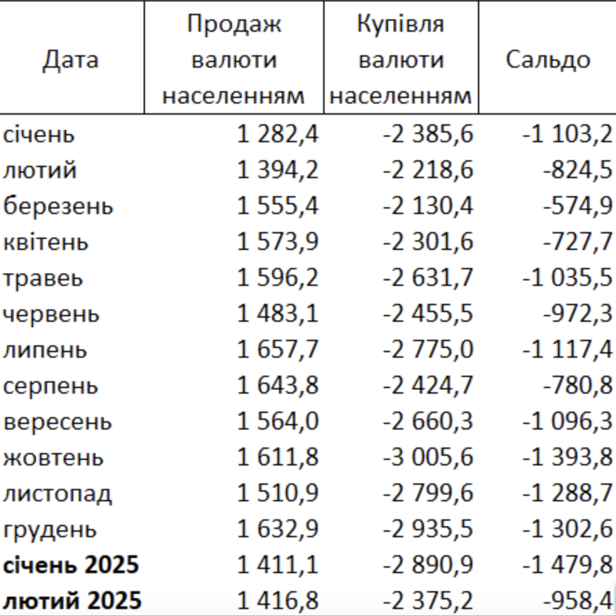 Населення в лютому 2025 року продало комерційним банкам готівкової та безготівкової валюти на $1,417 млрд (в еквіваленті) і купило на $2,375 млрд.»