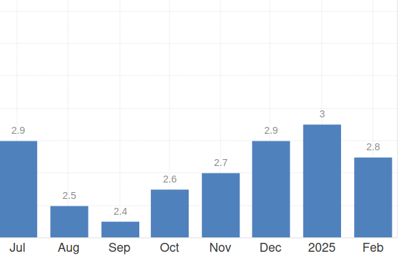 Рост индекса потребительских цен (CPI) в США замедлился до 2,8% в феврале с 3% в январе. Об этом свидетельствуют данные tradingeconomics.