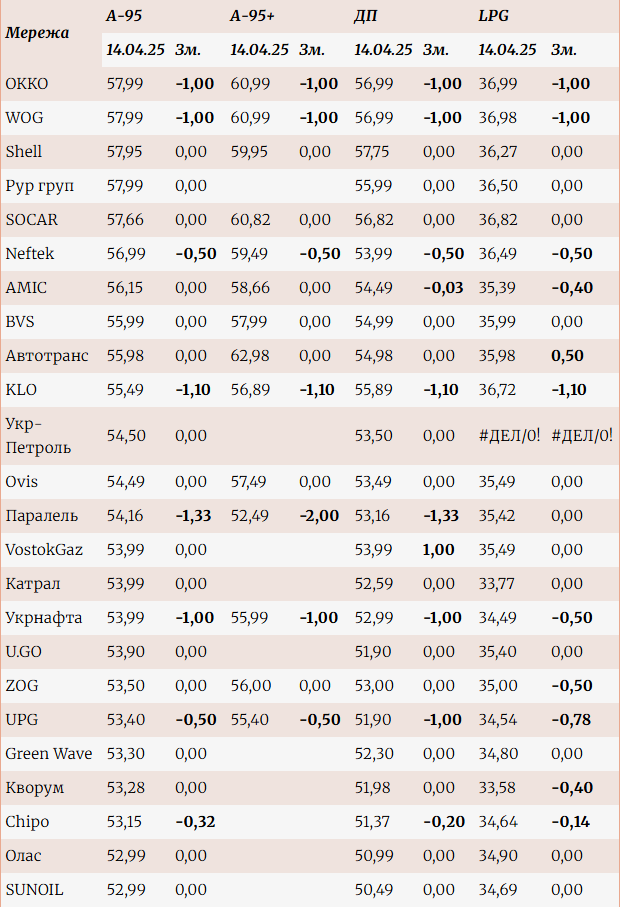 Изменение розничных цен на топливо на АЗК с 7 по 14 апреля 2025 г., грн/л: