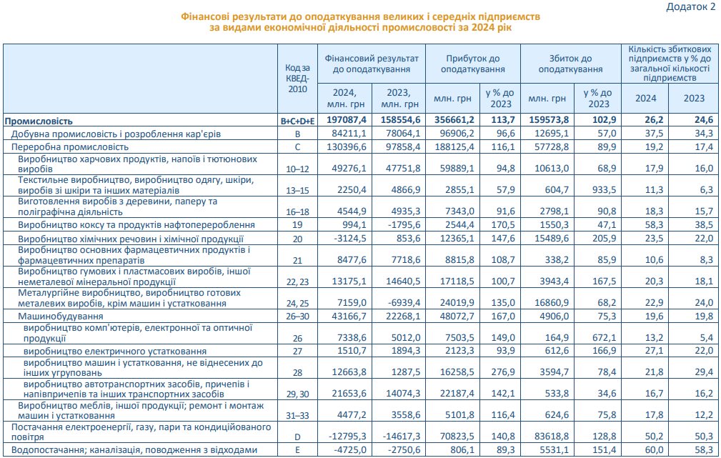 В 2024 году финансовый результат до налогообложения крупных и средних предприятий составил 947,3 млрд грн прибыли (в 2023 году — 776,4 млрд грн). Прибыль достигла 1 220,6 млрд грн, или 119,0% по сравнению с 2023 годом, убытки допущены на сумму 273,3 млрд грн (или 109,7%). Об этом свидетельствуют данные Государственной службы статистики.