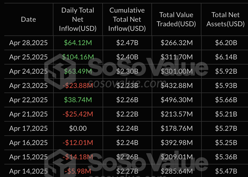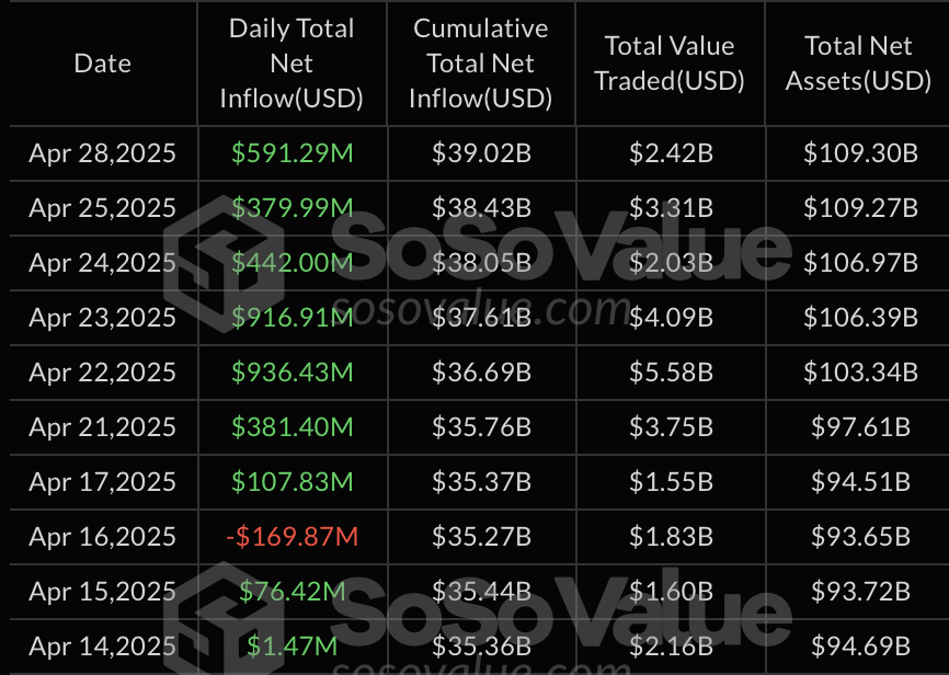 28 апреля 2025 года спотовые биткоин-ETF зафиксировали приток капитала на сумму $591,29 млн. Об этом свидетельствуют данные SoSoValue. Положительная динамика наблюдается уже седьмой торговый день.