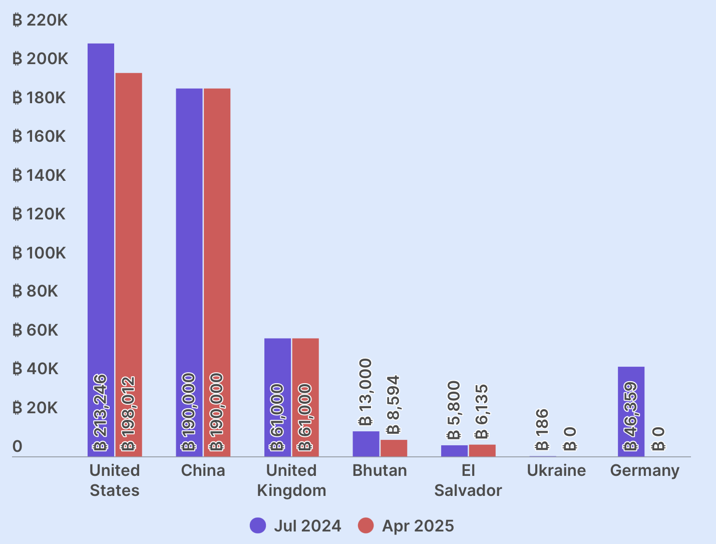 По состоянию на апрель 2025 года правительства разных стран коллективно владеют более 463 741 BTC, что составляет около 2,3% от общего предложения биткоина. Об этом говорится в отчете CoinGecko.