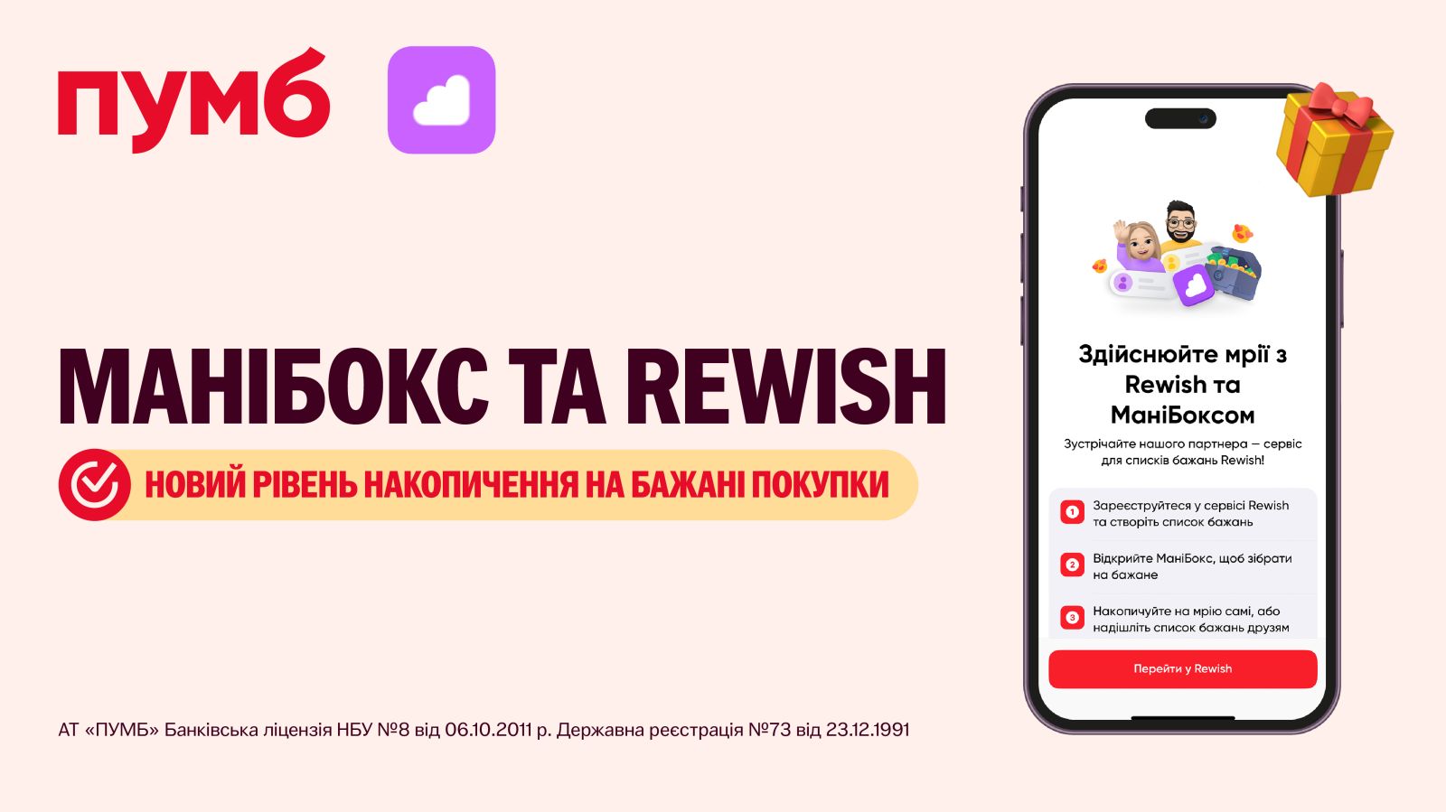 ПУМБ расширяет возможности своих клиентов благодаря интеграции МаниБокса с сервисом Rewish! Теперь планировать желаемые покупки и накапливать деньги стало проще и удобнее.