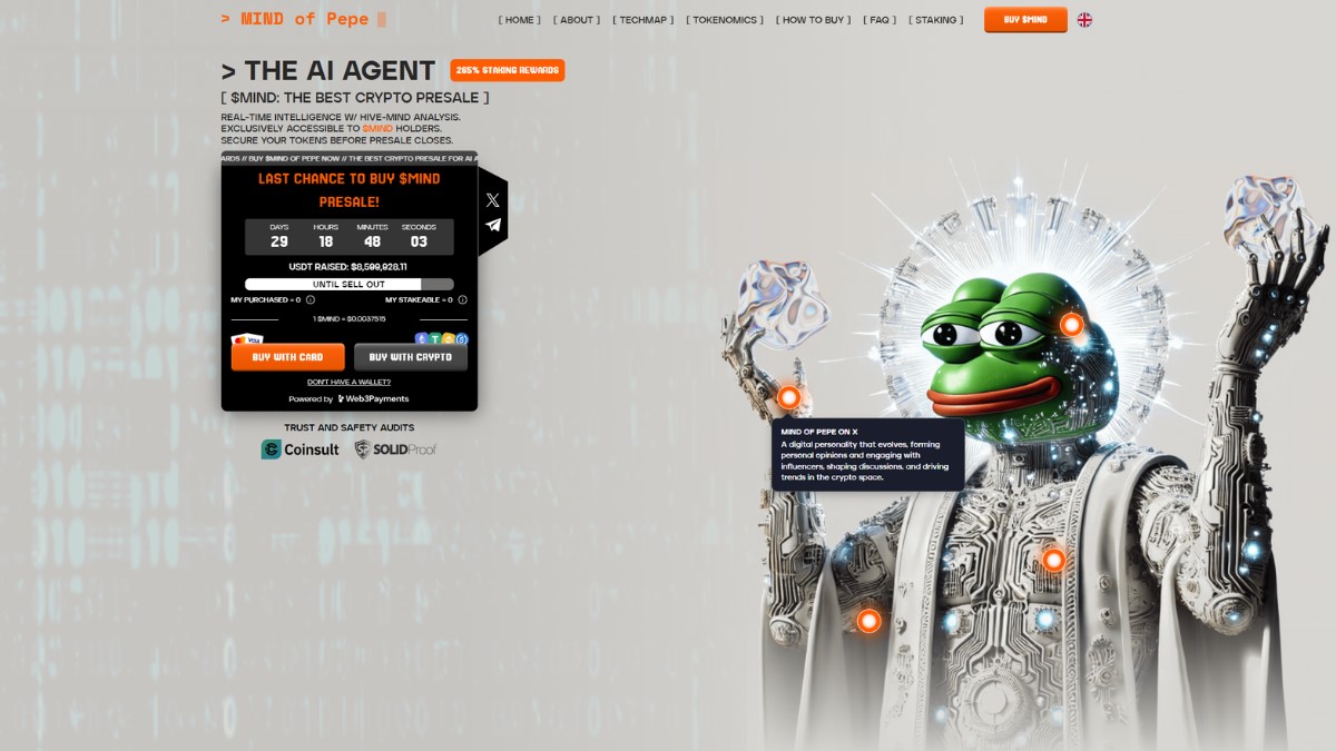 Mind of Pepe ($MIND) — это проект, который переосмысливает возможности мем-монет. Он представляет собой первую масштабную попытку интеграции технологии автономного ИИ-агента в концепцию мемной криптовалюты.