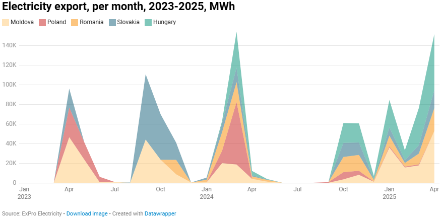 При этом в прошлом месяце больше электроэнергии было экспортировано в Венгрию (38%) и Молдову (35%).
