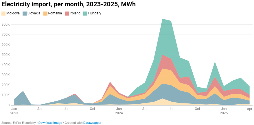 Пик импорта был 11 апреля, более 20 тысяч. МВт-ч, а уже после 20 апреля объемы поставленной электроэнергии из-за границы значительно сократились.