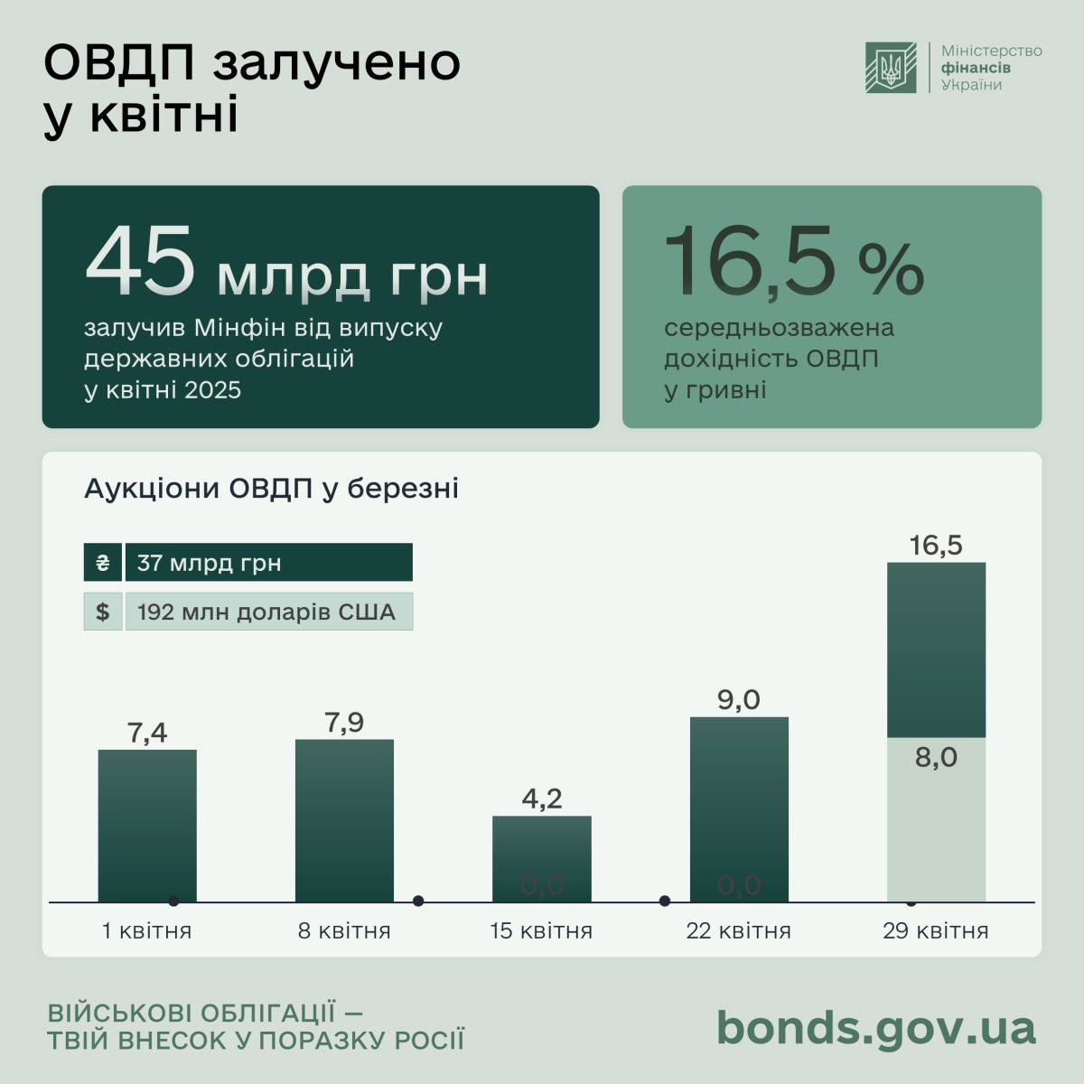 В апреле 2025 года Министерство финансов Украины привлекло от выпуска государственных облигаций 45 млрд грн в эквиваленте: 37 млрд грн и $192 млн. Об этом говорится в сообщении Министерства.