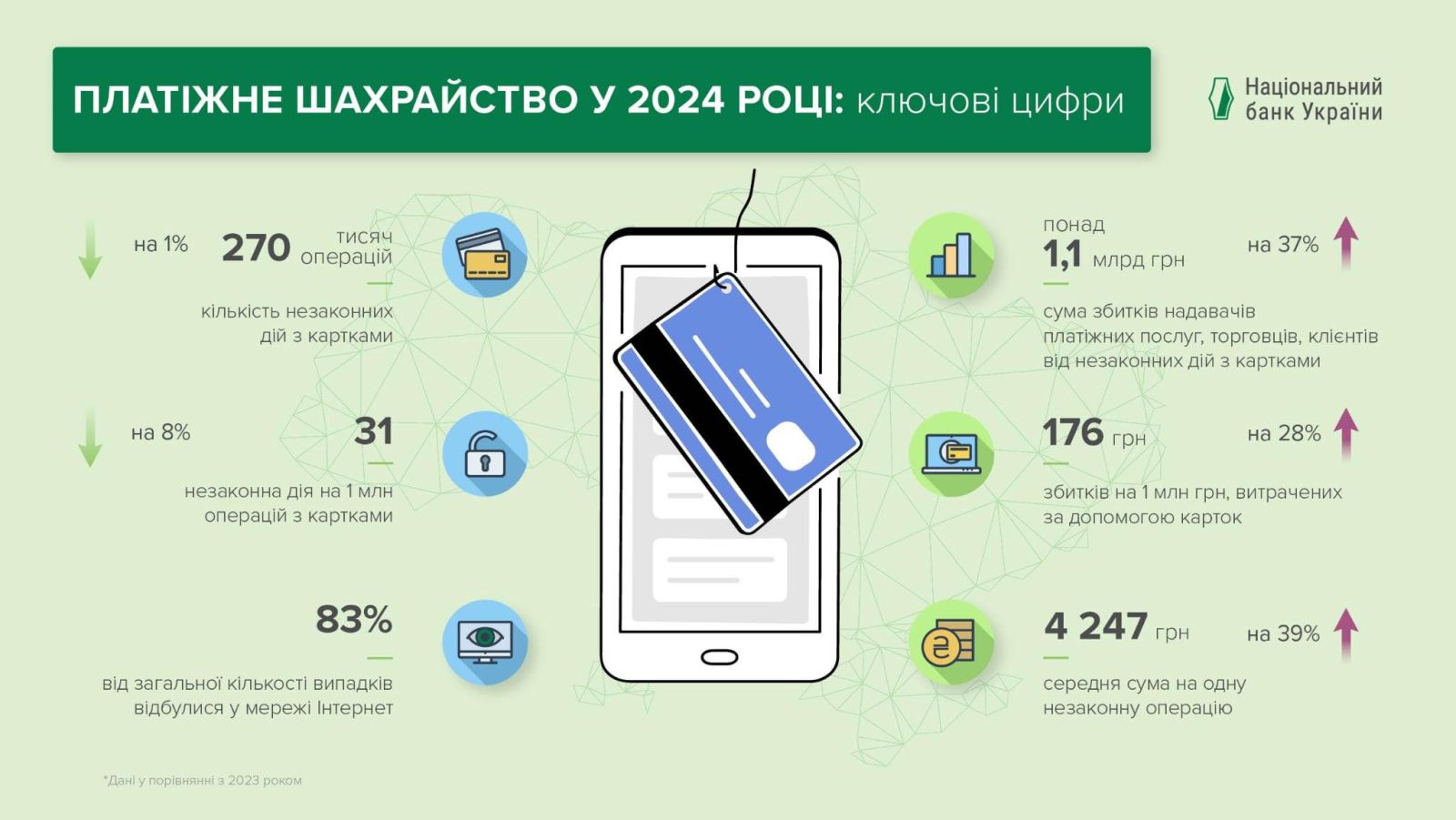 В 2024 году количество мошеннических операций с платежными картами в Украине уменьшилось на 1% (2 тысячи операций) — до 270 тысяч, но сумма убытков выросла на 37%, достигнув 1,1 миллиарда гривен. Об этом пишет пресс-служба НБУ.