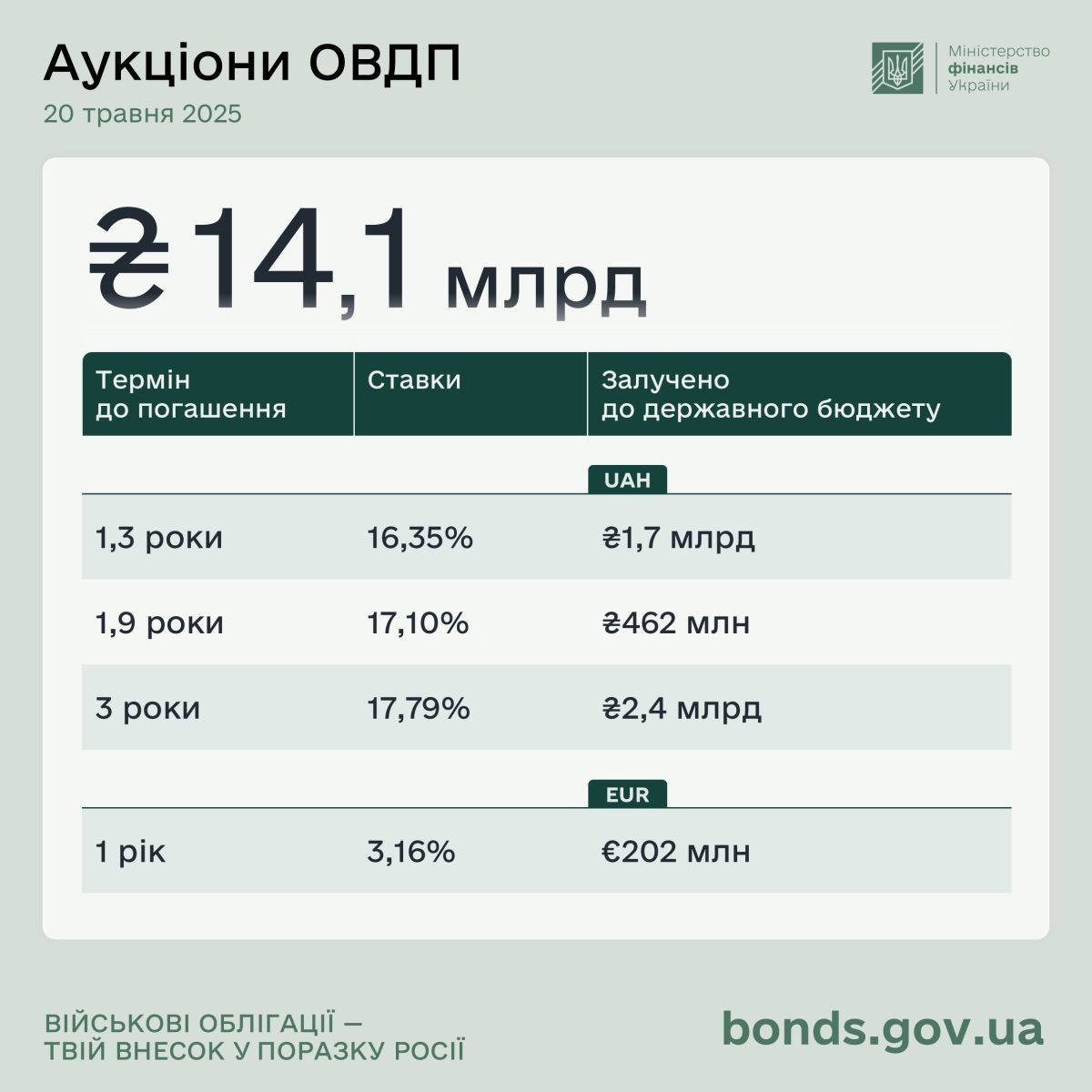 Министерство финансов 20 мая на аукционе по размещению облигаций внутреннего государственного займа (ОВГЗ) привлекло в государственный бюджет 14,10 млрд грн, что на 8,21 млрд грн больше, чем на прошлой неделе — 5,89 млрд грн. Об этом свидетельствуют данные министерства.