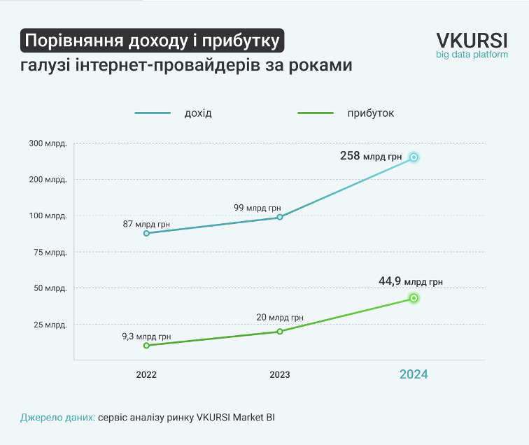 В 2024 году совокупный доход отрасли интернет-провайдеров, зарегистрированных в Украине, достиг отметки в 258 млрд грн, что в 2,6 раза больше, чем в 2023 году (99,2 млрд грн).