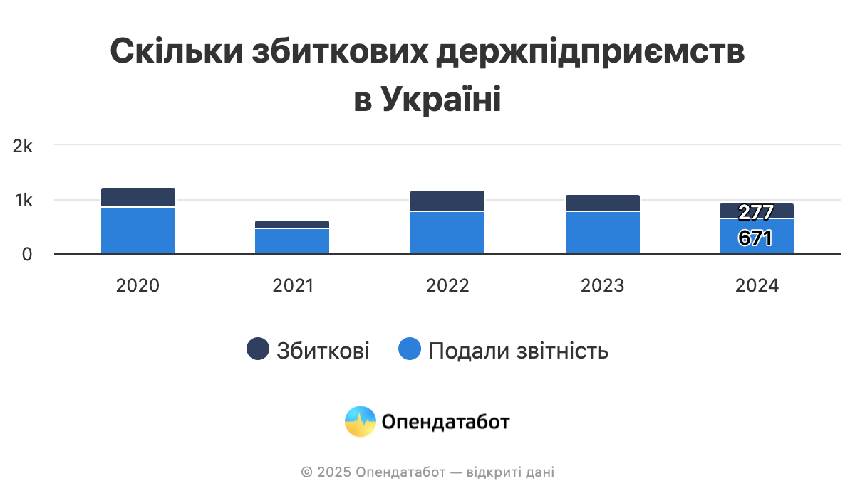 59% из всех зарегистрированных госпредприятий не сдали финансовые отчеты в 2024 году — это 963 компании. Из отчитавшихся 41% оказались убыточными (почти столько же, как в 2023 году). Об этом говорится в данных Опендатабот.