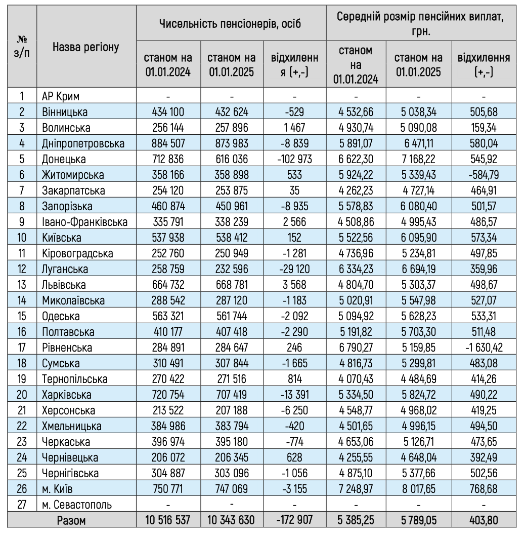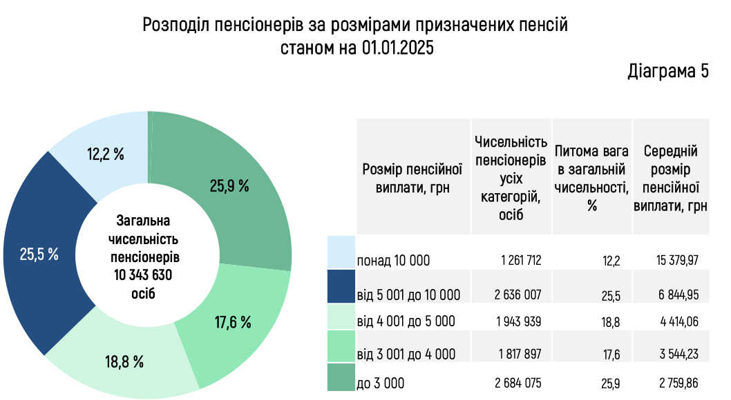В отчете отмечается, что средний размер пенсии на 1 января 2025 составил 5 789,05 грн, что на 403,80 грн, или на 7,5% больше, чем за аналогичный период предыдущего года. Минимальный размер пенсии по возрасту составляет 2361,00 грн.