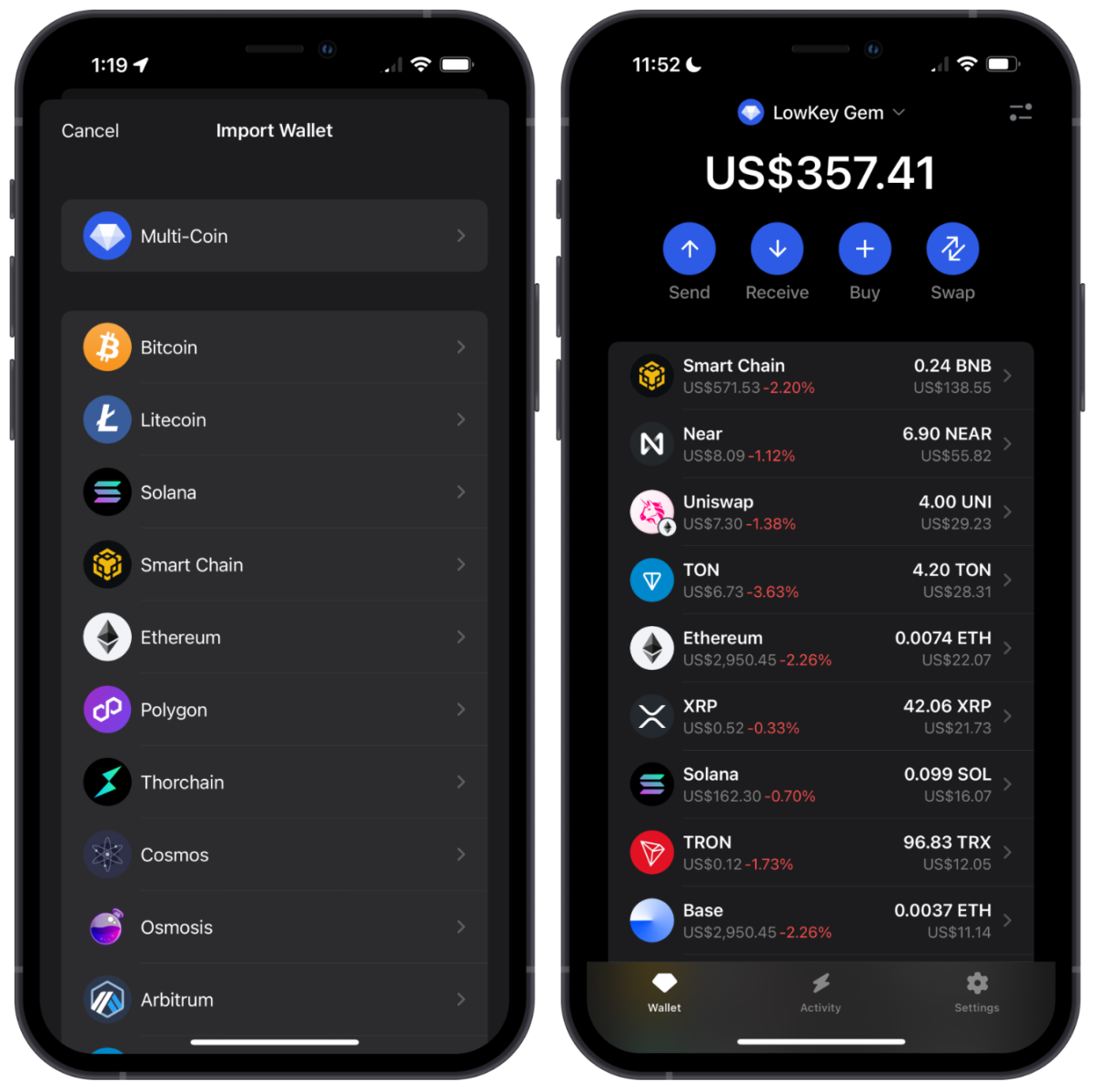 - Удобство. Генерация QR-кодов для отправки средств, поддержка WalletConnect, DEX-агрегатор для выгодного курса.