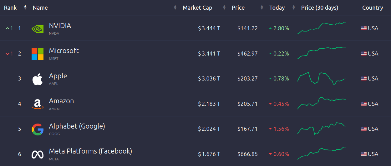 По итогам торгов Nvidia достигла капитализации в $3,444 триллиона, опередив Microsoft с показателем $3,441 триллиона. С июня 2023 года Nvidia периодически выходит на вершину, чередуясь с Apple и Microsoft. Nvidia в последний раз возглавляла рейтинг 24 января.