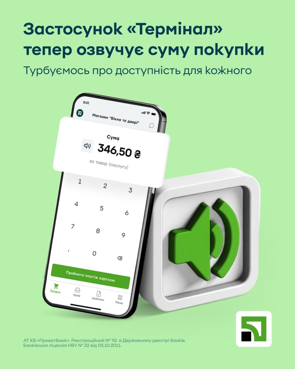Как сообщил руководитель направления торгового эквайринга Приватбанка Сергей Макаренко, в обновленной версии приложения уже работает новый функционал — озвучивание суммы оплаты для покупателей с нарушениями зрения. Теперь при оплате товаров картами или гаджетами с помощью Терминала, предприниматели или кассир магазина может нажать соответствующую иконку, после чего сумма оплаты будет озвучена для покупателя.