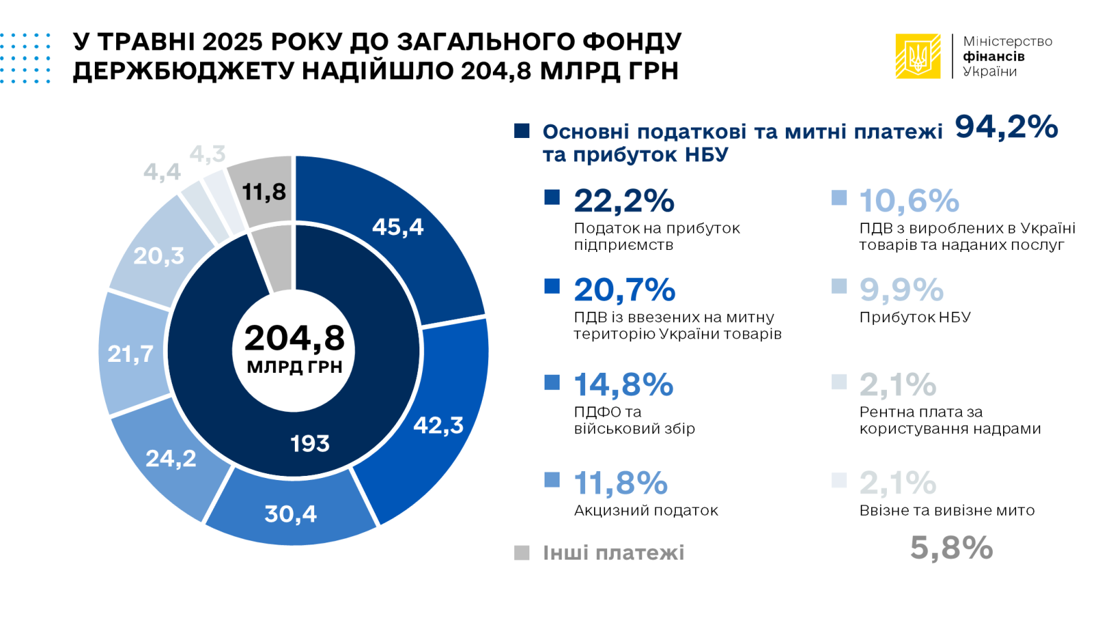 Кроме того, в мае 2025 года в общий фонд государственного бюджета поступило 20,3 млрд грн от НБУ, который в соответствии с Законом Украины «О Национальном банке Украины» ежегодно, после подтверждения его годовой финансовой отчетности внешним аудитом и утверждения Советом НБУ, перечисляет в государственный бюджет часть своей прибыли.