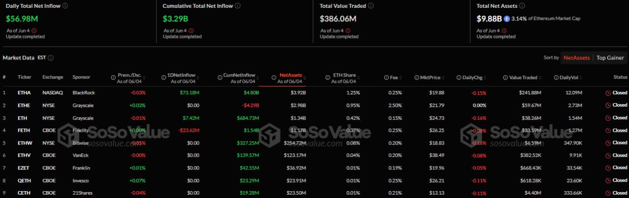 В секторе Ethereum-ETF положительная динамика длится 13 дней. 4 июня приток составил $56,98 млн. $73,18 млн привлек продукт ETHA от BlackRock, FETH от Fidelity столкнулся с оттоком на $23,62 млн. Фонд компании Grayscale получил $7,42 млн, в остальных продуктах движение средств не наблюдалось.