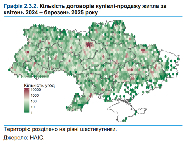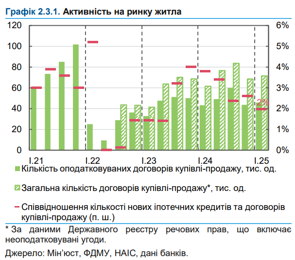 «Эффект ситуативной подпитки рынка вследствие активной внутренней миграции ослабляется. Без улучшения ожиданий безопасности или доступных механизмов страхования от военных рисков для договоров ипотеки спрос вряд ли будет заметно расти», — отметили в НБУ.