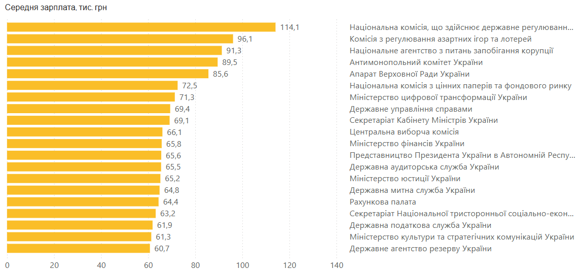 Лидирует по уровню зарплат Национальная комиссия, осуществляющая государственное регулирование в сферах энергетики и коммунальных услуг (114,1 тысяч гривен). В НКРЭКУ работают 525 человек.