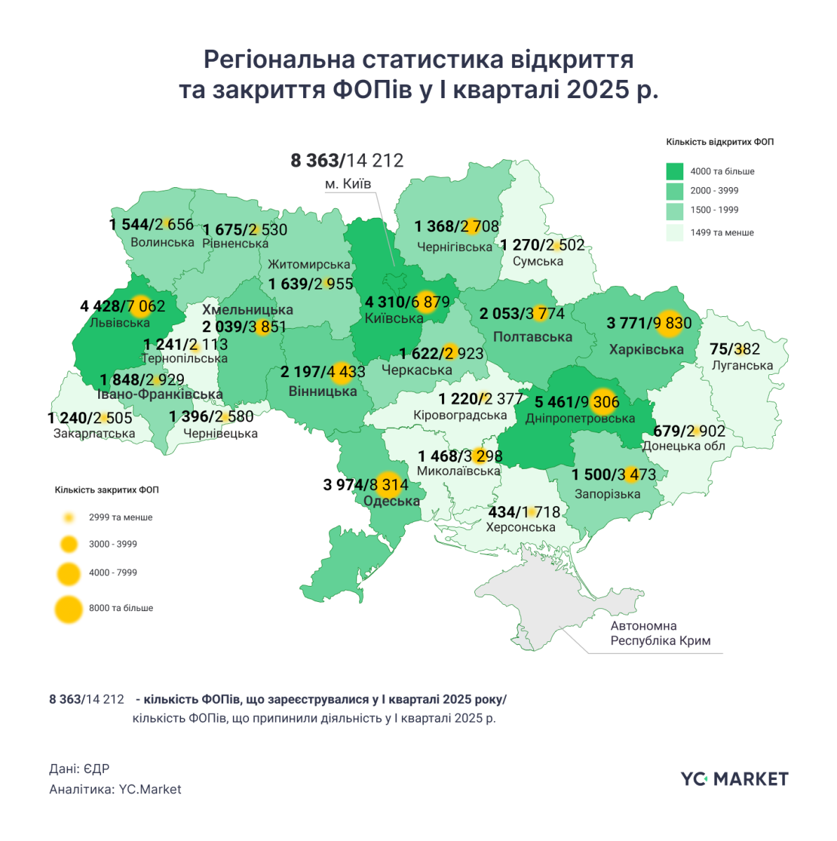 Закрытие по регионам. Первенство по количеству ликвидированных ФОП содержит столица. В г. Киеве в I кв. 2025 г. прекратили деятельность 14 212 ФОПов. Среди областей больше всего закрытий зафиксировано в Харьковской (9830) и Днепропетровской (9306). Далее следуют Одесская область (8314), Львовская (7062) и Киевская (6879).