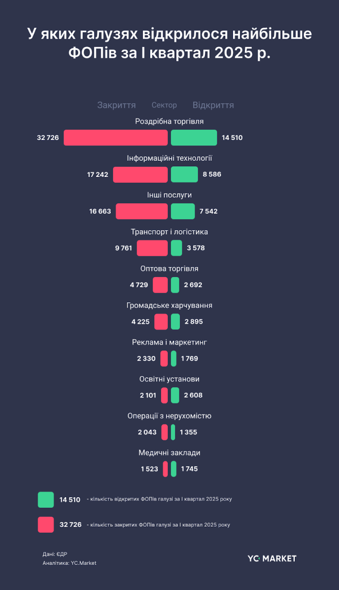 «Антирейтинг» возглавляет розничная торговля — в I кв. 2025 г. закрылись 32 726 ФОП против 21 222 в предыдущем квартале. Это самый большой объем ликвидаций среди всех секторов.