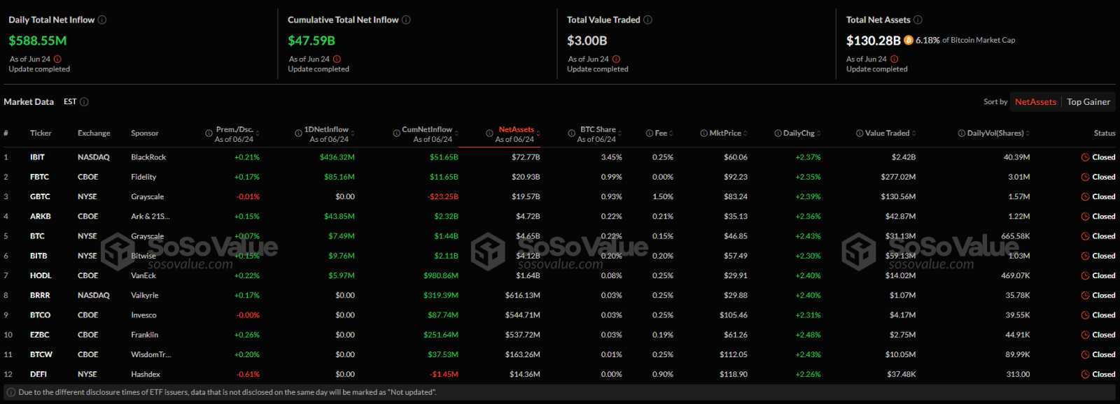 Во вторник, 24 июня, сегмент спотовых фондов США на базе биткоина и Ethereum получил чистый приток в $659,8 млн. Основная часть капитала поступила в инвестиционные продукты на базе первой криптовалюты — $588,6 млн. Об этом свидетельствуют данные SoSoValue.