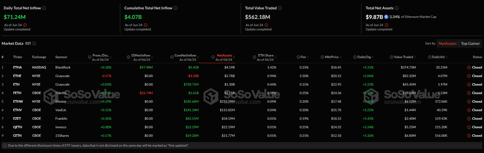В сегменте спотовых Ethereum-ETF зафиксирован чистый приток в $71,2 млн. Здесь единственным фондом, зафиксировавшим приток средств, стал продукт от BlackRock.