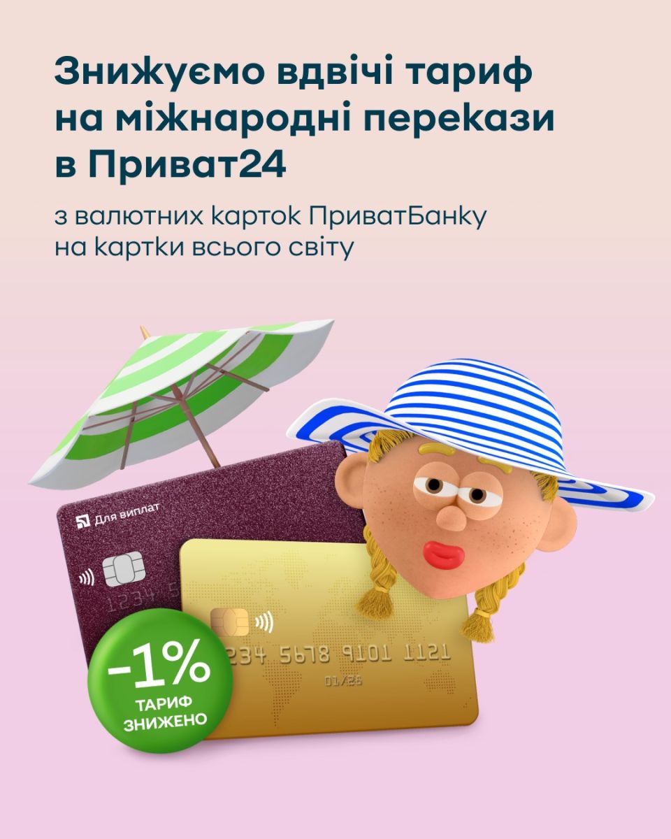 Приватбанк продлевает до конца 2025 года действие пониженных тарифов на международные переводы в Приват24 на зарубежные карты по всему миру. Как сообщил член правления банка по розничному бизнесу Дмитрий Мусиенко, для всех клиентов банка до 31 декабря 2025 года тарифы на международные переводы с валютных карт Приватбанка на зарубежные карты снижены вдвое до 1% (минимум 50 грн) вместо 2% (минимум 50 грн).