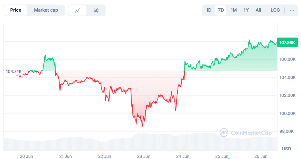 Первая криптовалюта продолжила восстановление на фоне уменьшения напряженности на Ближнем Востоке и уверенно близится к $108 000. Об этом свидетельствуют данные CoinMarketCap.
