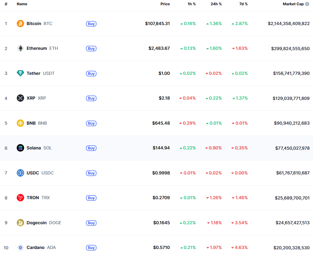 К моменту публикации новости цена биткоина составляет $107 845. За сутки актив вырос на 1,36%, за неделю — на 2,87%.