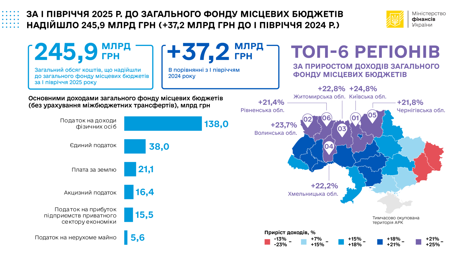 За I полугодие 2025 года в общий фонд местных бюджетов поступило 245,9 млрд грн, что на 37,2 млрд грн больше чем за I полугодие 2024 года. Об этом говорится в сообщении Министерства финансов.