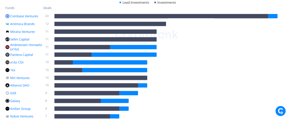 По количеству сделок лидером стал Coinbase Ventures с 24 инвестициями. В первую пятерку также вошли Animoca Brands, a16z и Pantera Capital.