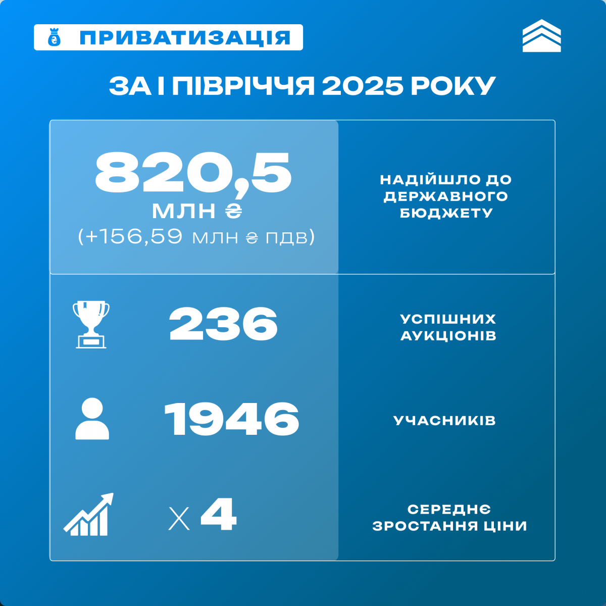 По результатам первого полугодия 2025 года от приватизации в государственный бюджет уже поступило 820,5 млн. грн. (+156,59 млн. гривен НДС), таким образом, совокупный экономический эффект составил более 977 млн. грн. Об этом сообщает пресс-служба Фонда государственного имущества Украины.