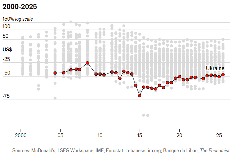 В 2018 году гривна по индексу Биг Мака была недооценена на 65,1% — больше всего в мире. Тогда подчеркивалось, что реальный курс гривны должен составлять 9,68 грн/$.