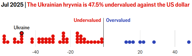 Украинская гривна недооценена по отношению к доллару на 47,5%. При этом гривна поднялась с шестого на восьмое место с конца в списке самых недооцененных валют мира в обновленном индексе Биг Мака. Об этом говорится в данных рейтинга The Economist за июль 2025 года.
