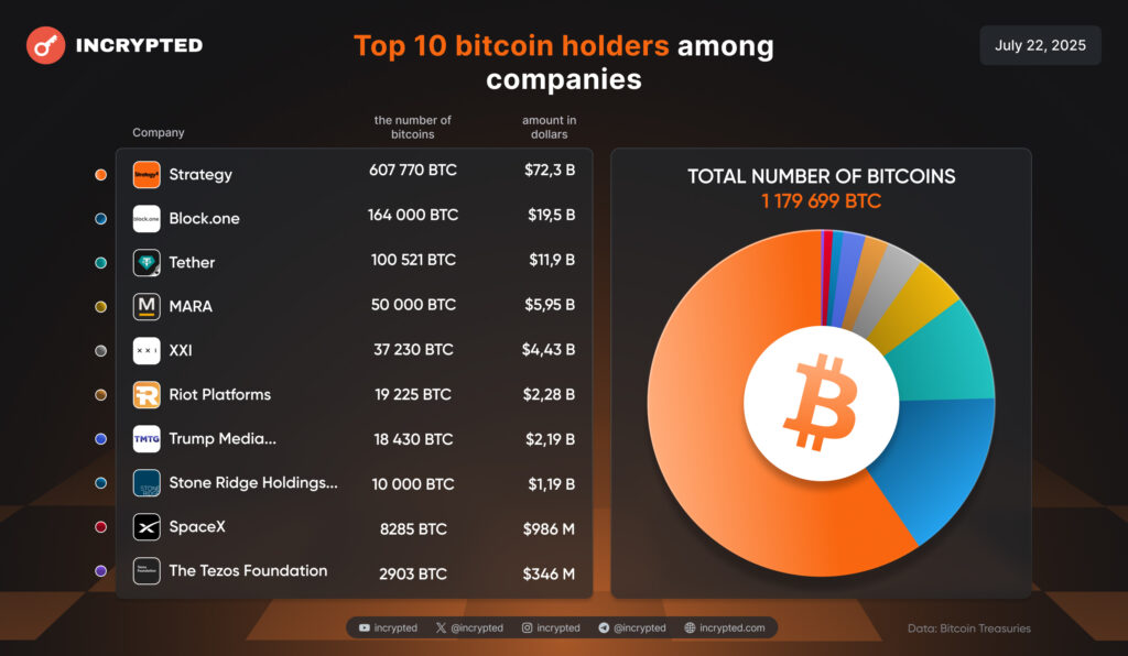 Компания Strategy (ранее MicroStrategy), крупнейший корпоративный владелец биткоинов, стала примером для множества других контрагентов. В результате частные и публичные фирмы со всего мира накопили в общей сложности 1,18 млн BTC (около $139,5 млрд), по данным Bitcoin Treasuries, пишет incrypted.