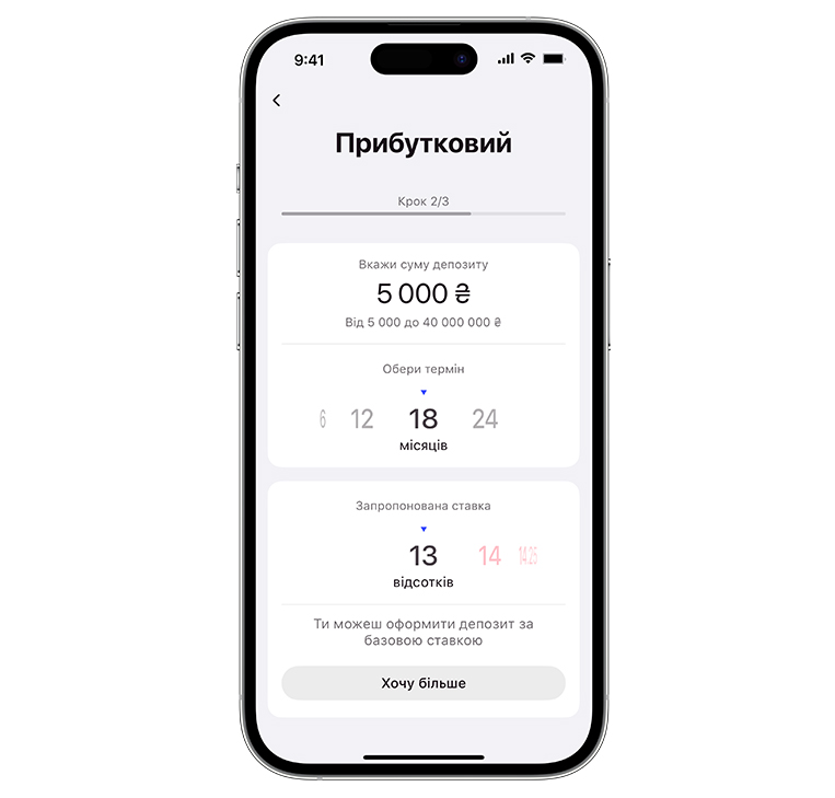 Шаг 2. Укажите сумму, срок, а также способ выплаты процентов. В случае с депозитом «Прибутковий», здесь доступна опция с повышенной ставкой — для этого достаточно нажать кнопку «Хочу больше» или покрутить «барабан» ставок и выбрать повышенную, ознакомившись с требованиями к сумме. Увеличивая сумму вклада, клиент может увеличить ставку вплоть до 1,5% годовых.
