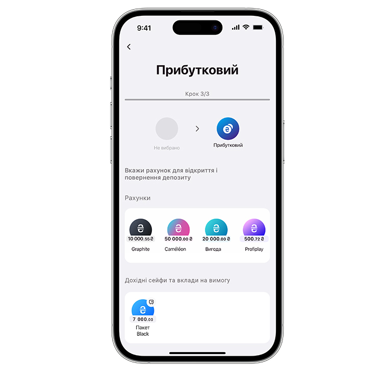 Шаг 3. Выберите счет, с которого будут списаны средства. Доступные варианты — текущий или карточный счет, «Дохідний сейф» или счет по вкладу до востребования.