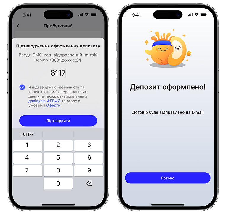 Шаг 5. Подтвердите операцию с помощью смс-кода, согласитесь с условиями, нажмите «Готово» — и депозит оформлен. Договор приходит на электронную почту. После открытия депозита клиенту доступно управление пролонгацией множество раз, кроме последнего дня действия соглашения, пополнение, изменение счета возврата.