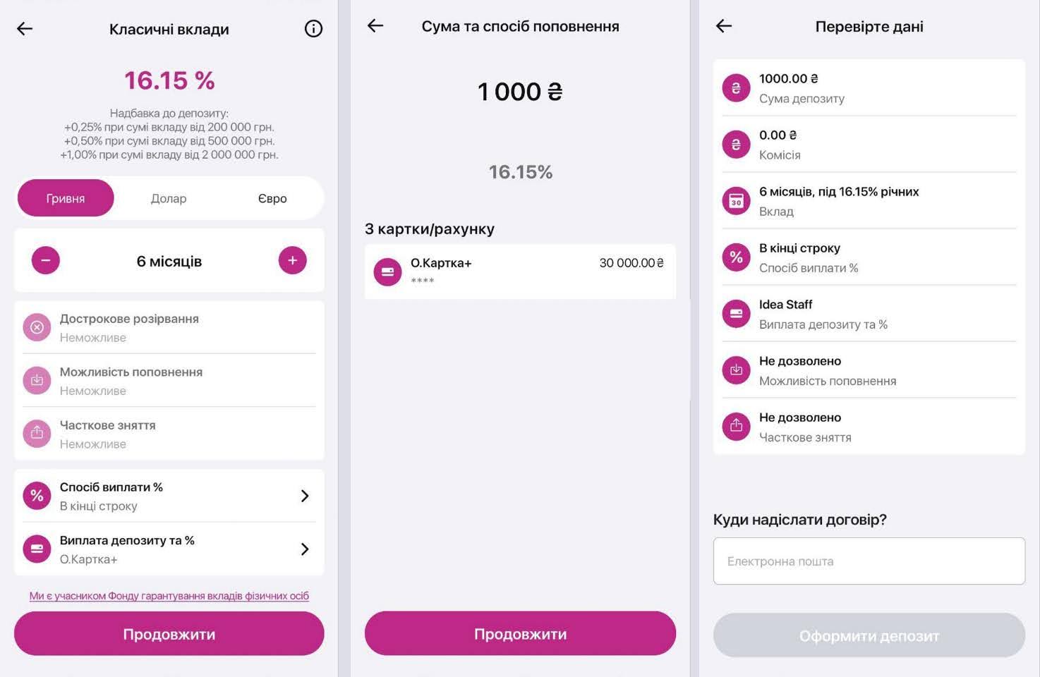 Важно, что условия вкладов одинаковые, независимо от способа оформления — онлайн или в отделении. Но некоторые продукты, в частности, акционные «Класичні вклади+ онлайн», доступны исключительно через приложение O.Bank.