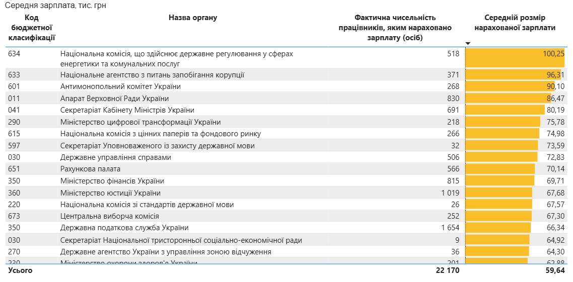 Средняя зарплата руководства ведомств составляет 128,0 тысячи гривен.